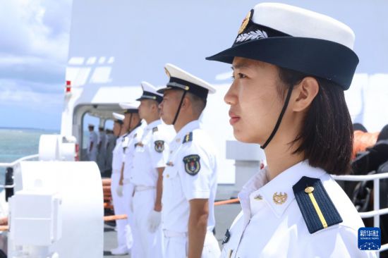 10月13日,执行“和谐使命-2025”任务的中国海军“丝路方舟”号医院船抵达汤加努库阿洛法港。这是医院船官兵分区列队。新华社发(王俊川 摄)