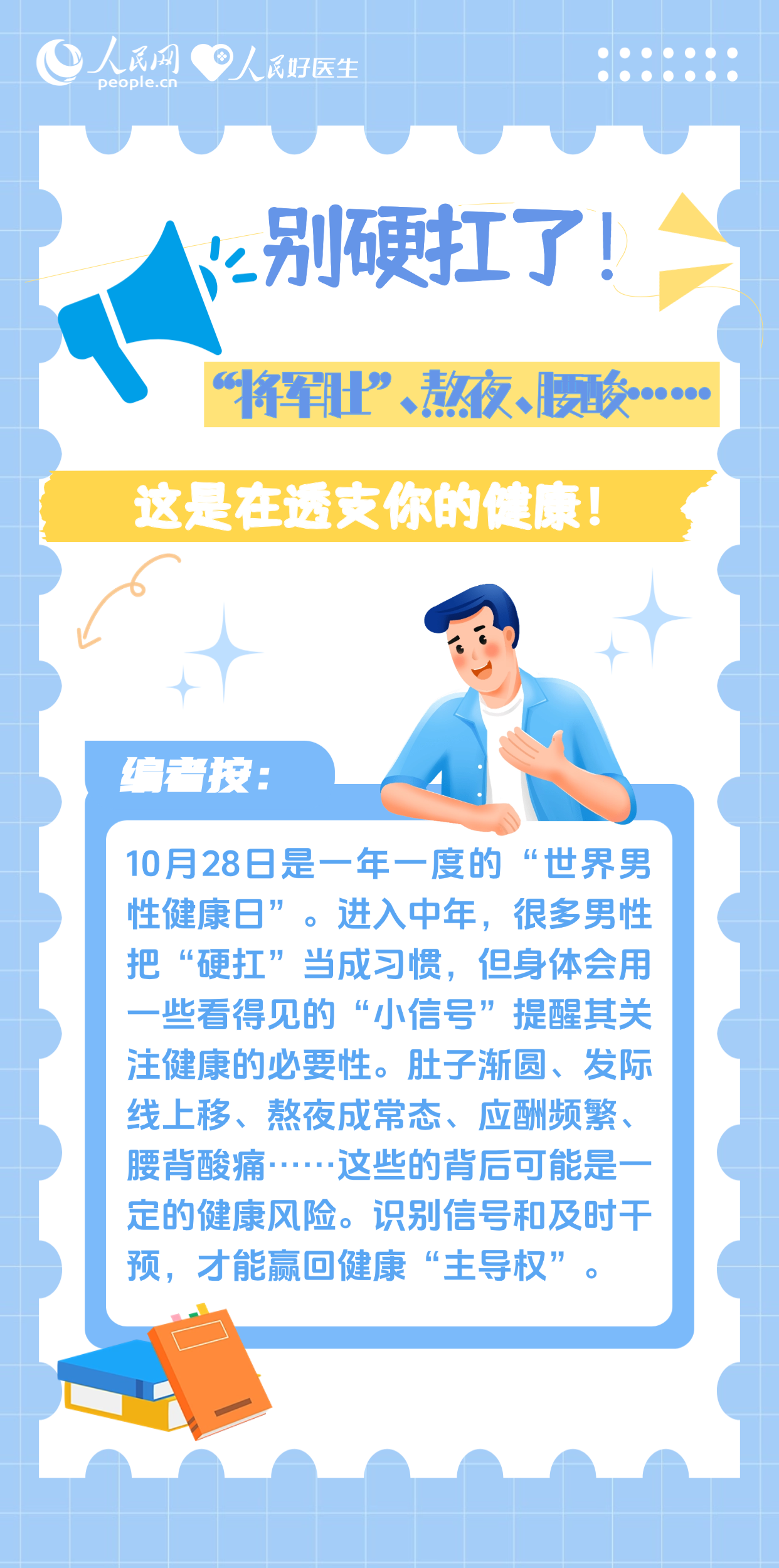 编者按:10月28日是一年一度的“世界男性健康日”。进入中年,很多男性把“硬扛”当成习惯,但身体会用一些看得见的“小信号”提醒其关注健康的必要性。肚子渐圆、发际线上移、熬夜成常态、应酬频繁、腰背酸痛……这些的背后可能暗藏着健康风险。识别信号和及时干预,才能赢回健康“主导权”。
