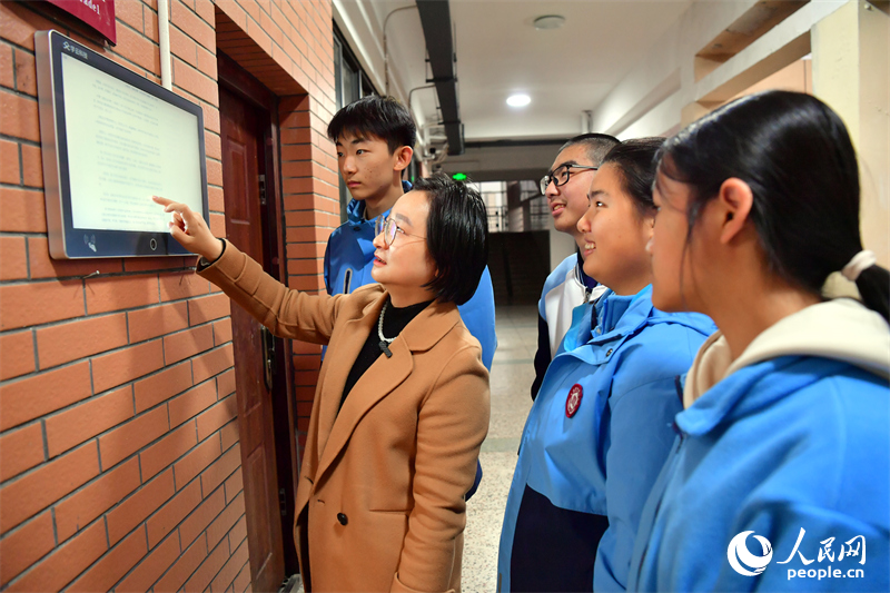 课间,老师和学生们翻阅电子屏里人民网的内容。人民网记者 时雨摄