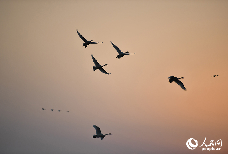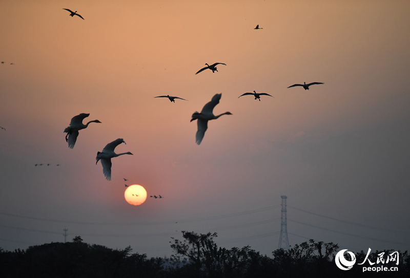 落日余晖,江西南昌高新区五星白鹤保护小区上空候鸟归巢。人民网记者 时雨摄