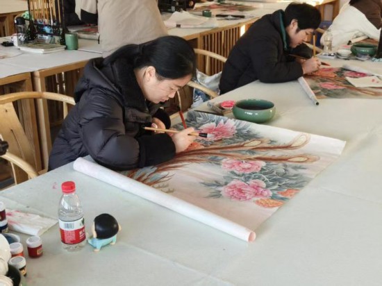 巨野工笔牡丹画知名度颇高,全国80%工笔牡丹画出自当地,图为鲁西书画院的学员正在作画。(记者 赵雅南 报道)