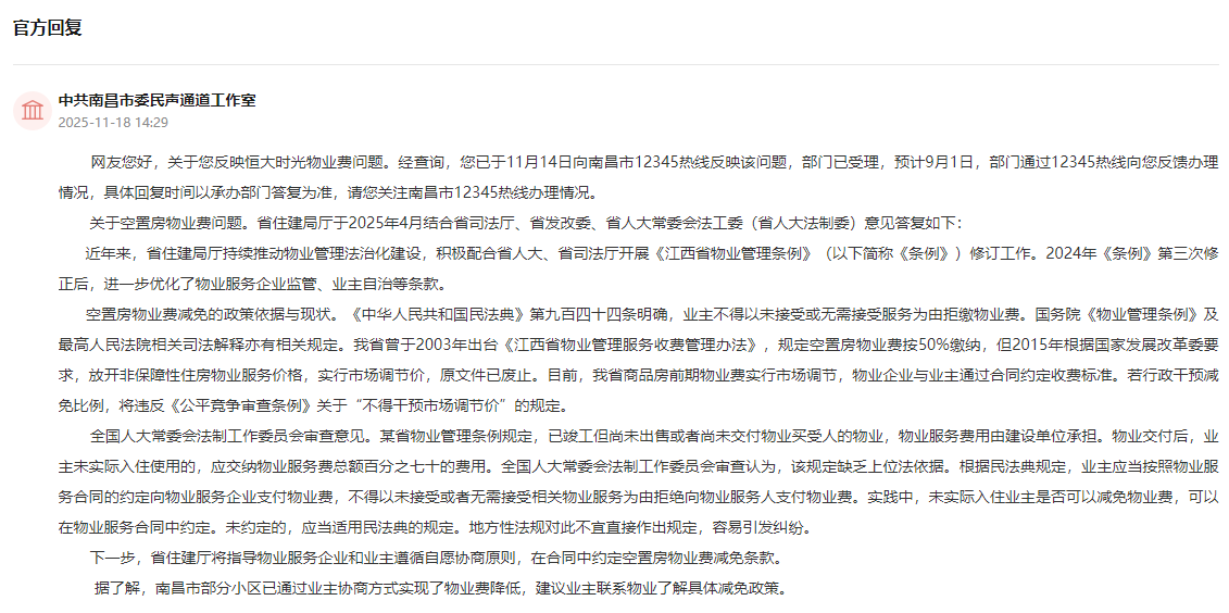 下一步,江西省住建厅将指导物业服务企业和业主遵循自愿协商原则,在合同中约定空置房物业费减免条款。据了解,南昌市部分小区已通过业主协商方式实现了物业费降低,建议业主联系物业了解具体减免政策。