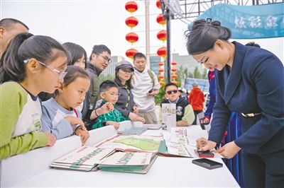 10月3日,工作人员在内蒙古博物院广场为现场观众集章打卡。2025年国庆黄金周期间,呼和浩特市文化旅游广电局在内蒙古博物院北广场推出“遇见青城”特装展区系列宣传活动,通过社教体验、文艺演出、集章打卡等多种形式,全面展示呼和浩特深厚的文化底蕴与丰富的文旅、文博资源。记者 王磊摄