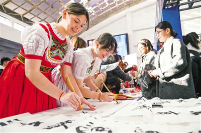 11月1日,来自俄罗斯的留学生在活动中写书法。当日,为弘扬中华优秀传统文化,促进中外文化交流互鉴,内蒙古师范大学第二届国际文化节在赛罕校区开幕,来自14个国家的1000余名中外学子欢聚一堂,乐享文化盛宴。本届国际文化节以“一带一路筑梦,文化交融暖心”为主题,突出互动性与参与性,通过各国民俗文化展示、文艺表演、美食体验等多元形式,搭建起跨文化对话的桥梁。记者 王磊摄