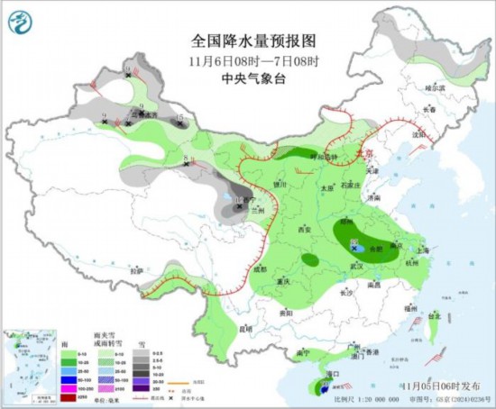 11月6日8时至7日8时,新疆北部和东部、青海东部、甘肃中西部、内蒙古中西部和东北部、黑龙江中北部、河北西北部等地部分地区有小到中雪或雨夹雪,其中,新疆沿天山地区、青海东北部、甘肃河西等地部分地区有大到暴雪(10~15毫米),新增积雪2~8厘米,局地10厘米以上。内蒙古河套地区、河南中南部、湖北东北部、安徽中部、重庆东北部、海南岛中东部等地部分地区有中到大雨,其中,海南岛东南部局地有暴雨(50~70毫米)。新疆北部和东部、甘肃河西、内蒙古中西部、辽东半岛地部分地区有4~6级风;南海西南部海域有9~11级风、阵风11~12级,南海中西部海域有7~9级风、阵风10级。