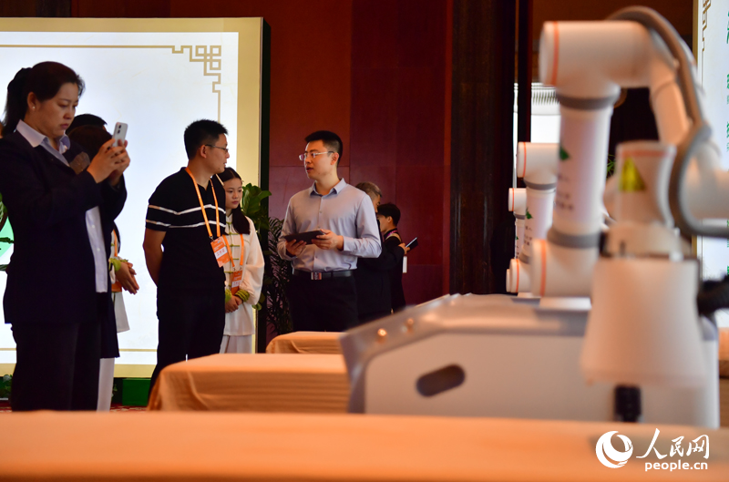 江西中医药大学工作人员向参观者介绍热敏灸机器人的使用方法。人民网记者 时雨摄