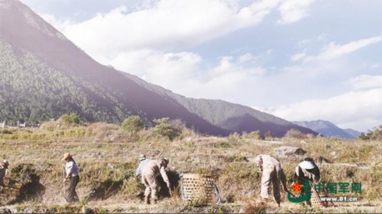 露水打湿迷彩裤,战士们全然不顾,张天德手把手教年轻战友分秧插秧。阿嘎次姆撑着拐杖坐在田埂上,看着忙碌的身影泪光闪烁,不时递上酥油茶。