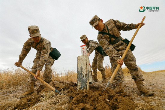 周李(左一)和战友一起埋设新标石。郭 斌 摄