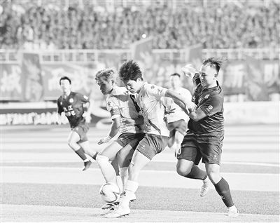 9月28日,赣超八强淘汰赛第二回合比赛,坐镇主场的新余队与九江队展开激战。双方1∶1战平。图为两队队员在比赛中争抢。记者 杨继红摄