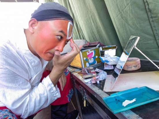 “啊啊啊、咿咿咿……”10月1日上午7时许,秋日的清晨还裹着几分凉意,曹县南湖人民广场临时搭建的化妆间里,曹县剧团演员丁天佑正坐在镜前忙着勾描油彩,嘴里的唱腔却没停,他要为即将开演的“一元大戏”开嗓预热。