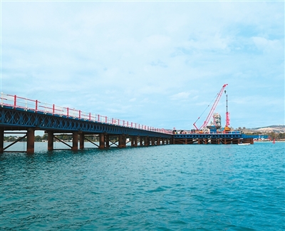 记者日前在大桥项目现场看到,陆上桩基工程大部分已完成,两条钢结构栈桥从比塞大运河南北两岸分别向水中延伸数十米,运输和安装大型钢筋笼和钢管的机械设备正忙碌地沿着栈桥开往水中作业平台,中国和突尼斯工人有条不紊地进行切割、焊接、吊装等工作,现场一派繁忙景象。