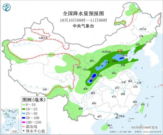 全国降水量预报图(10月9日08时-10日08时)