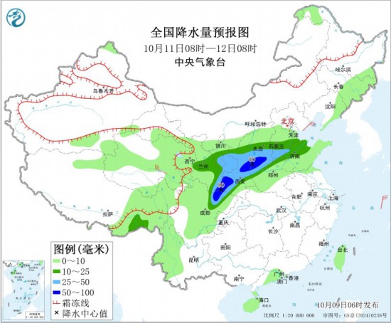 9日至13日,西北地区东部、四川盆地、华北、黄淮等地部分地区有中到大雨,局地暴雨或大暴雨。其中,9日,陕西北部、山西中北部、河北中部、天津、山东中北部等地部分地区有大到暴雨,河北西部局地有大暴雨。中央气象台10月9日06时继续发布暴雨蓝色预警。