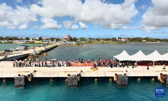 10月13日,执行“和谐使命-2025”任务的中国海军“丝路方舟”号医院船抵达汤加努库阿洛法港。这是欢迎仪式现场。新华社发(崔晓洋 摄)