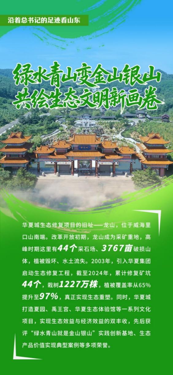 在威海,有这样一片神奇之地——曾经,矿坑遍布、山体破碎;如今,绿意盎然、景色迷人。威海华夏城的华丽转身,不仅是“生态优先”初心的坚守,更是威海市大力推进生态文明建设、争当美丽山东建设排头兵的生动缩影。