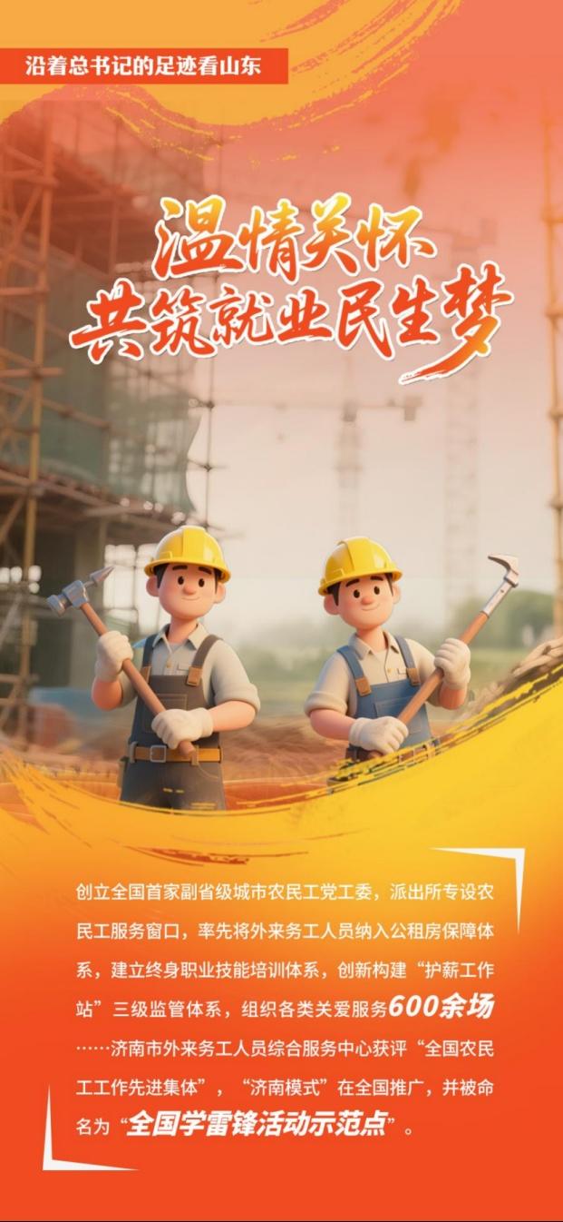 这份温情实践赢得广泛认可:济南市外来务工人员(农民工)综合服务中心获评“全国农民工工作先进集体”,外来务工人员(农民工)综合服务“济南模式”在全国推广,济南市外来务工人员(农民工)综合服务中心被命名为“全国学雷锋活动示范点”。济南以“干”字当头,不断完善服务链条,生动践行“健全城乡融合发展体制机制”要求,托举起百万农民工家庭的“就业民生梦”,让“更好融入城市”的愿景稳稳照入现实。(张达 王帅)