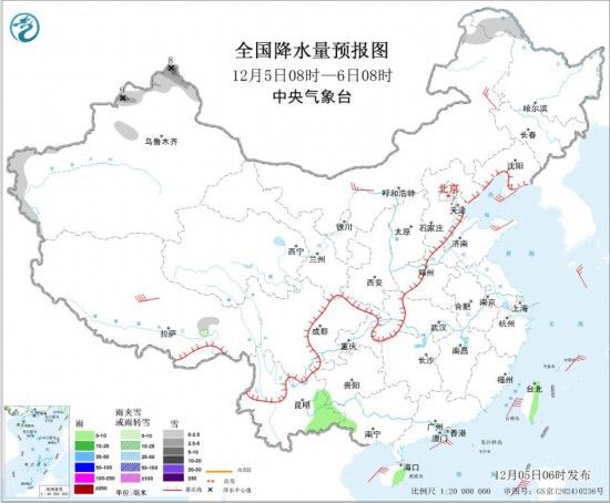 12月5日08时至6日08时,新疆北疆北部和南疆西部山区、内蒙古东北部、黑龙江西北部、西藏东部等地部分地区有小到中雪或雨夹雪,其中,新疆北疆北部等地有大雪(5~9毫米)。贵州西南部、云南东部、广西西部、海南岛、台湾岛等地部分地区有小雨。内蒙古中东部、辽东半岛、山东半岛等地部分地区有4~6级风,西藏北部有6~7级风,渤海、黄海北部、台湾海峡、巴士海峡、南海西部海域将有5~7级风,阵风8~9级。