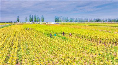 金秋时节,鄂尔多斯市杭锦旗吉日嘎朗图镇14万亩葵花正式进入收割期,集中连片满眼金黄的葵花与辛勤收割的农民共同构成了节日期间一道丰收的亮丽风景。记者 王磊摄